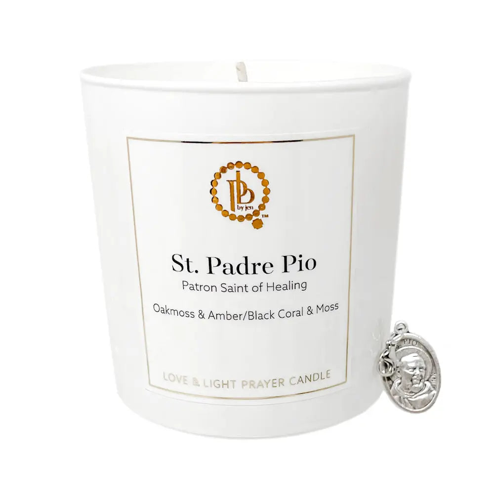 St. Padre Pio Prayer Candle- Patron Saint of Healing 10 oz Hand poured soy candle with prayer of St. Padre Pio on the back of the candle. A sweet 1" St. Padre Pio medal with lobster clasp is at the bottom of each prayer candle. This can be placed on a necklace, bracelet, keychain or given away to someone in need of St. Padre Pio's healing.