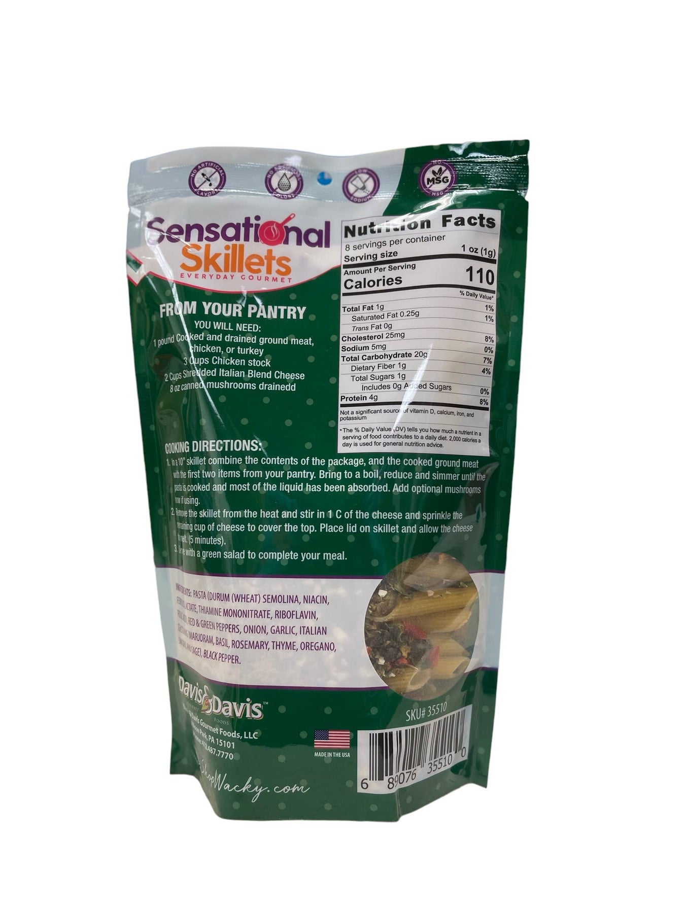 From your Pantry: 1 pound Cooked and drained ground meat, chicken, or turkey 3 Cups Chicken stock 2 Cups Shredded Italian Blend Cheese 8 oz canned mushrooms drained Directions: 1. In a 10” skillet combine the contents of the package, and the cooked ground meat with the first two items from your pantry. Bring to a boil, reduce and simmer until the pasta is cooked and most of the liquid has been absorbed.
