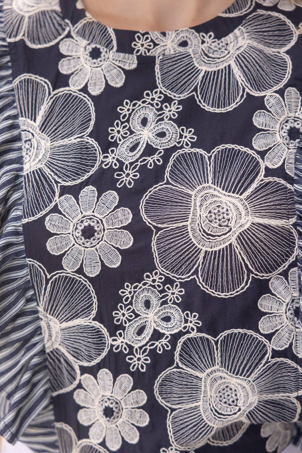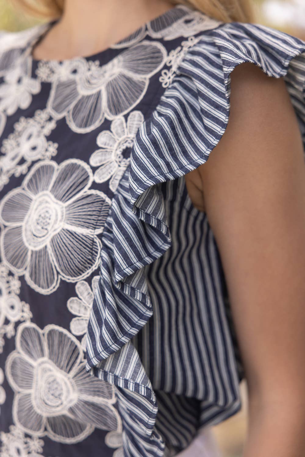 Women's Floral Embroidered Mixed Stripe Woven Ruffled Top