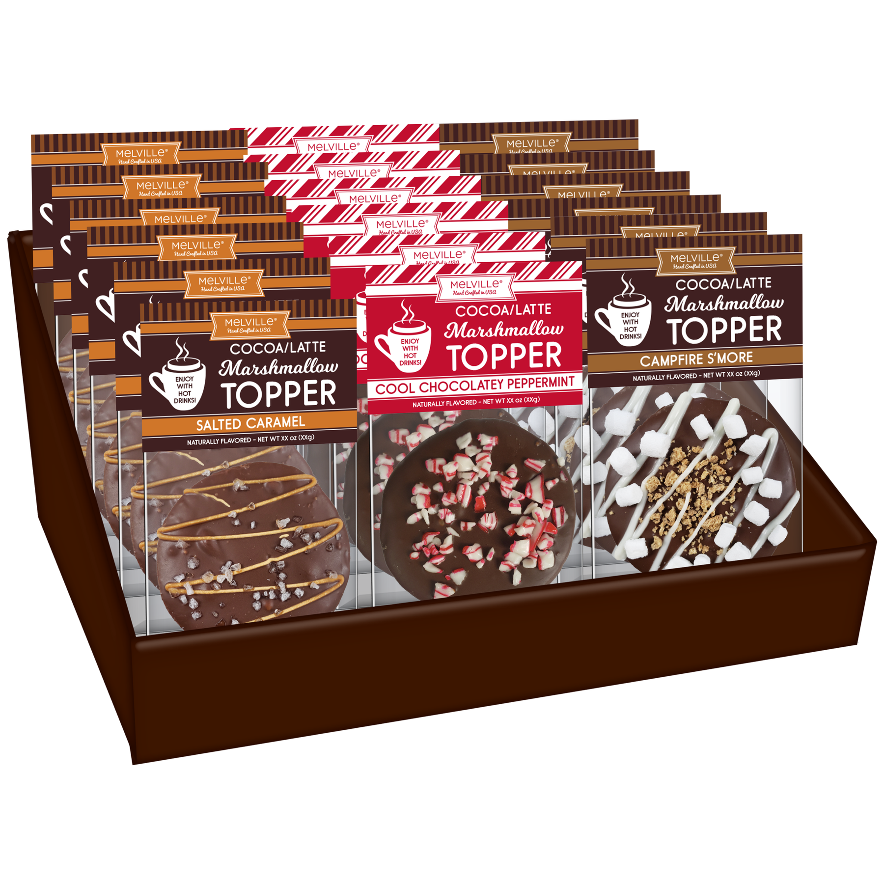 Our Chocolate-Dipped Marshmallow Toppers come in an assortment of Milk Chocolate S'mores, Salted Caramel, and Dark Chocolate Peppermint. Each topper is dipped in chocolate and decorated by hand. These are perfect for elevating your next cup of hot cocoa! Each topper is handmade; slight variations will occur.