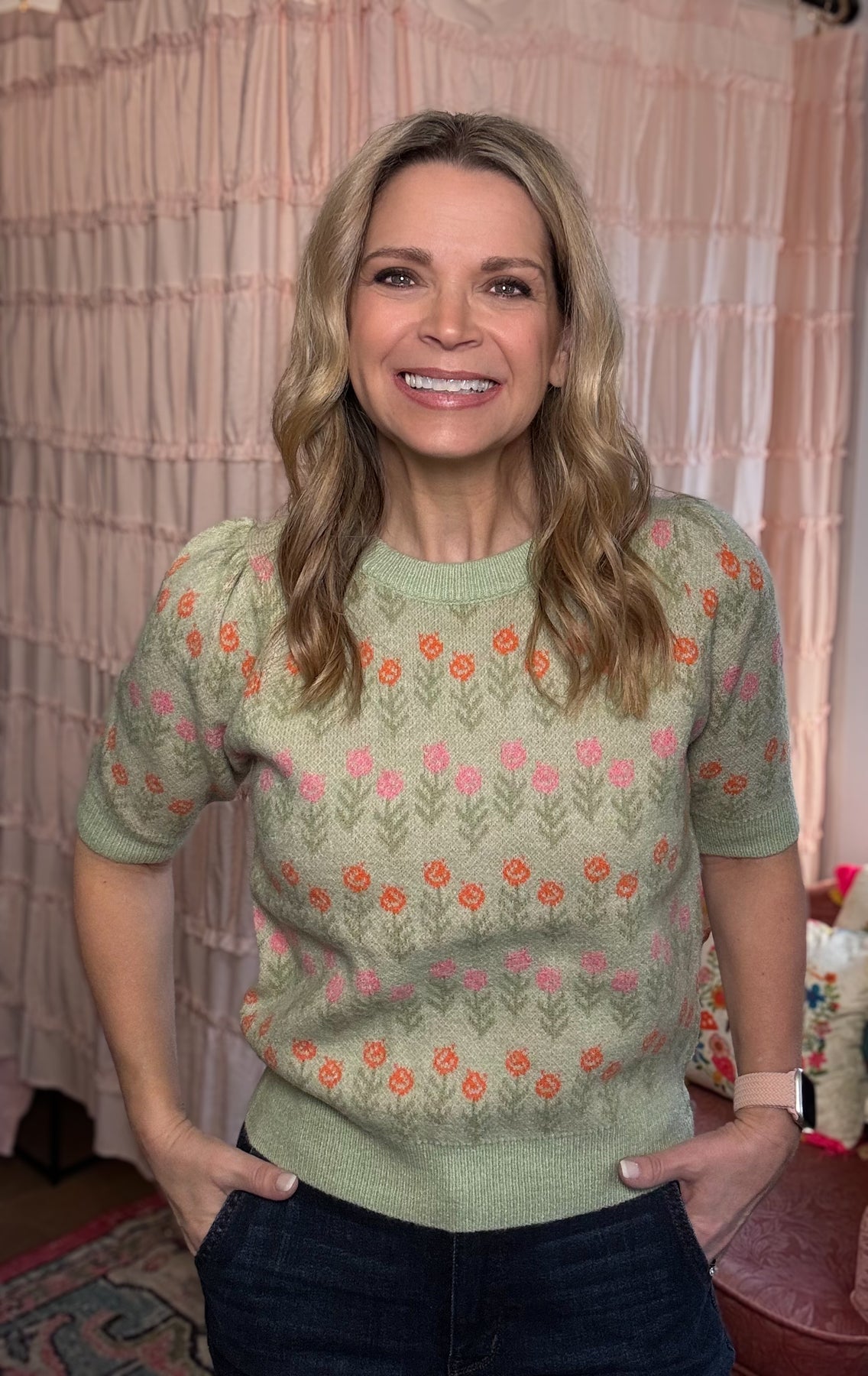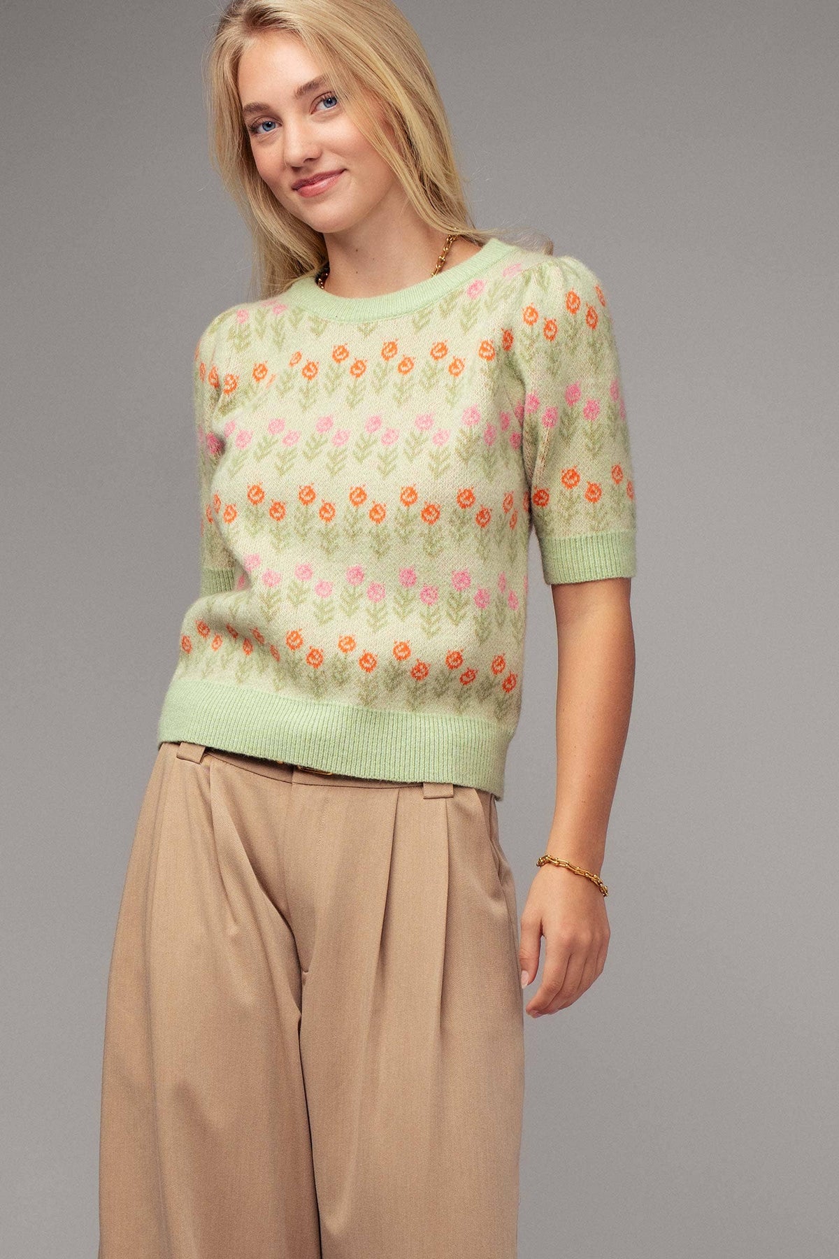 Featuring an all-over floral pattern, this sweater showcases rows of stylized pink and orange blooms accented with green foliage against a soft neutral background for a truly vintage-inspired look. The flattering crew neckline and short sleeves create an easy, wearable silhouette that transitions beautifully through the seasons.