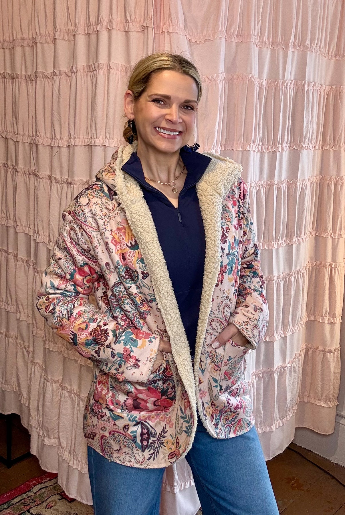 Stay warm in style with our Paisley Sherpa jacket. This cozy and versatile outfit choice is the perfect addition to your wardrobe!