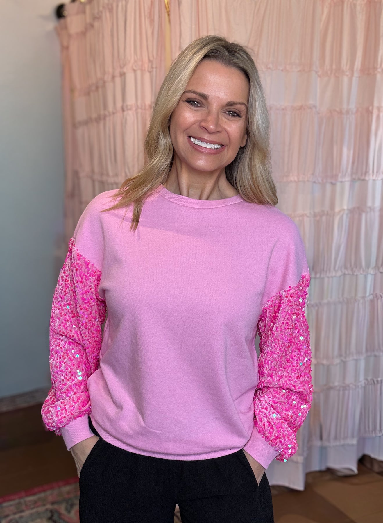 Shine bright and stand out in this stunning pink sequin long sleeve top! Designed to dazzle with its shimmering finish and flattering fit, this top brings the perfect mix of confidence and glam to your look. Effortlessly transition from day to night — because you deserve to sparkle wherever you go.