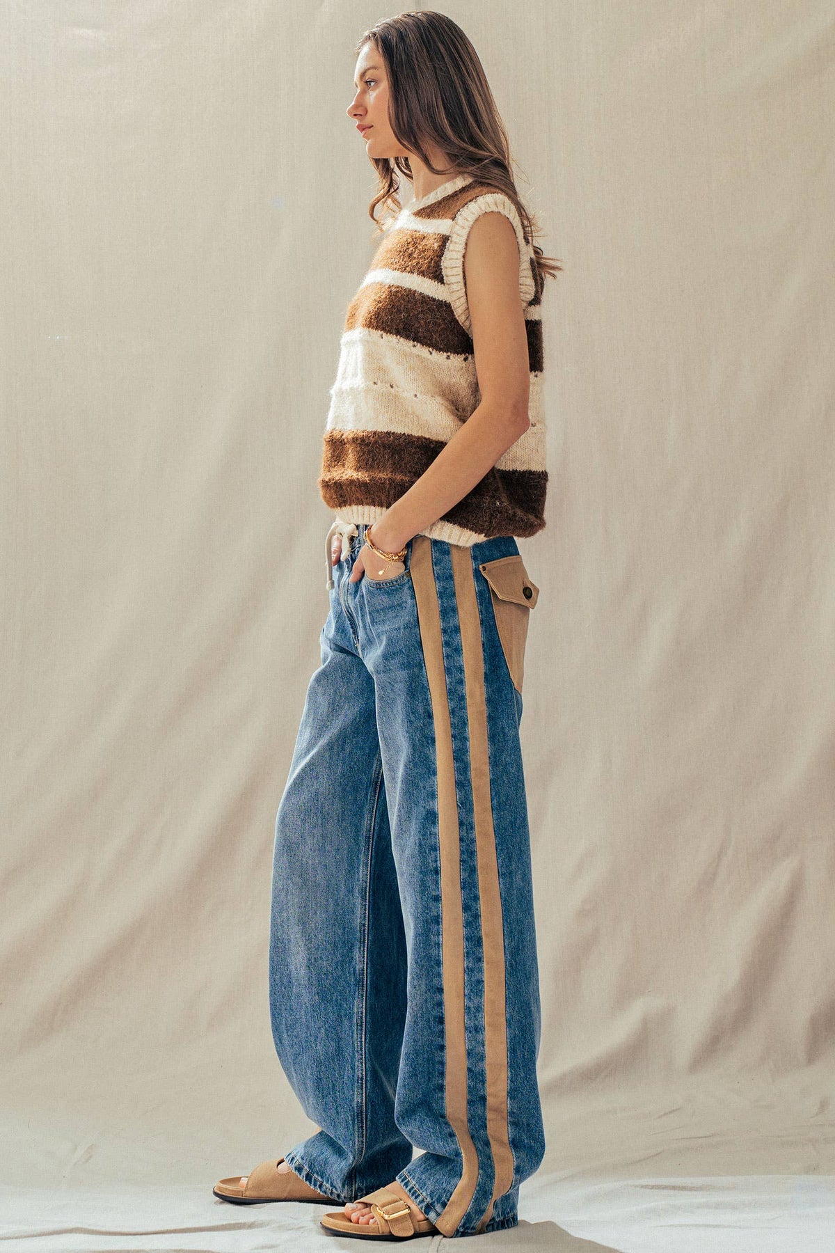 Add cozy texture and effortless charm to your fall and winter layers with this striped sweater vest. Crafted from a plush knit blend, it features a relaxed, slightly oversized silhouette that’s perfect for layering over tees, dresses, or jumpsuits. The bold stripe pattern adds a touch of boho flair while keeping your look warm and polished.