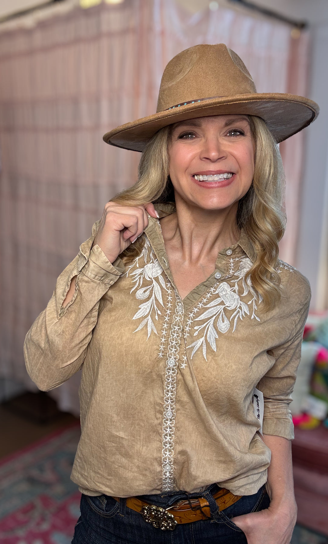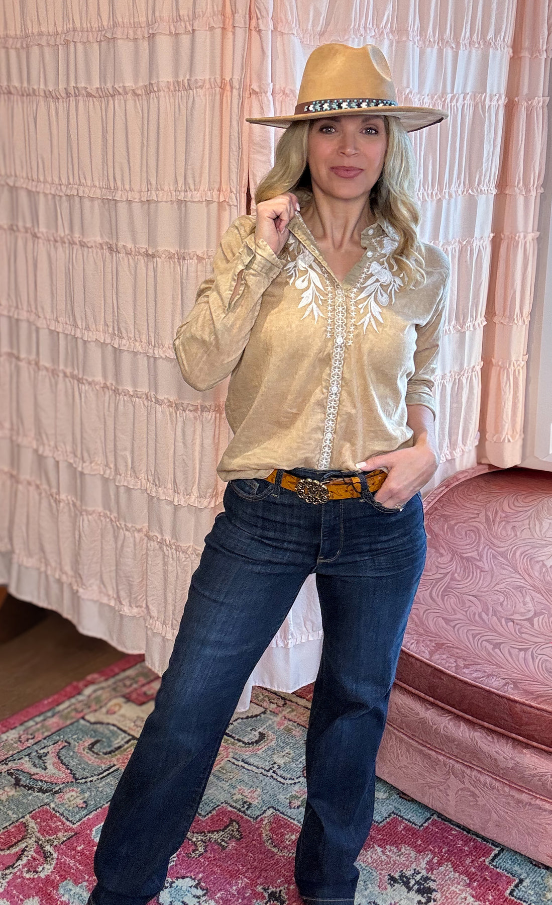 Crafted from 100% premium cotton and finished with a soft vintage wash, this button-down offers a perfectly worn-in feel while maintaining an upscale look. Delicate white embroidery traces the shoulders and placket, adding subtle artistry and a feminine touch that sets this piece apart.